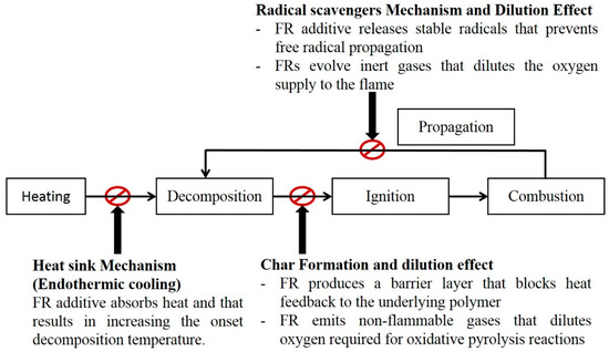 Combustion cycle can be divided into five stages. These stages are heating, decomposition, ignition, combustion and propagation [45]. Flame retardancy can be achieved by interrupting this cycle at any of these stages. There are three main ways to disrupt the combustion cycle. First, incorporation of additives that act as a heat sink and prevents the combustible material to reach pyrolysis temperature [30]. Second, addition of Flame Retardant (FR) compounds that produce non-flammable gases and form more char during pyrolysis. This char layer acts as an insulating layer that prevents oxygen and heat from interacting with the underlying material. The third method relies on interrupting the burning cycle during the combustion stage through adding FRs that release non-flammable gases and stable radicals that prevent progressive propagation of H· and O· free radicals and this leads to diluting the oxygen concentration in the flame zone [23,33]. Figure 2 shows the main FR mechanisms to interrupt the combustion cycle.