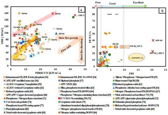 (a) THR versus PHRR/TTI for different FR/epoxy resin systems; (b) FR wt.% versus flame retardancy index (FRI) for different FR/epoxy resin systems.