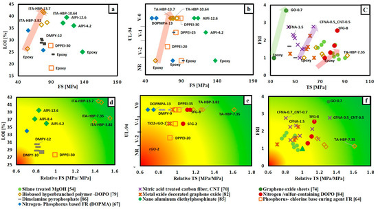 Selection chart of FR type regarding the desired flame retardance level and the mechanical property for epoxy resin. (a) LOI% versus FS; (b) UL-94 versus FS; (c) FRI versus TS; (d) LOI% versus relative FS; (e) UL-94 versus relative TS; (f) FRI versus relative TS.