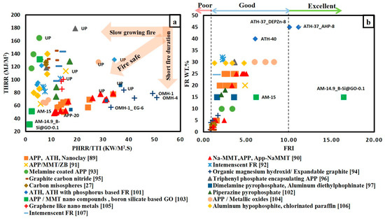 Figure 5a gives a bright view for the flame retardancy performance of various FR/unsaturated polyester system. Similar to Figure 4a, the addition of FRs reduced both the THR and PHRR/TTI ratio for polyester system. It was previously mentioned that FRI value is more representative in comparing the effect of different FRs on unsaturated polyester. Figure 5b illustrates the variation in FRI values for different FRs with different weight percentages. It is obvious that almost all points are in the good zone, except four points located in the poor zone and two points located in the excellent zone. The four points in the poor zone corresponded to organic magnesium hydroxide (OMH) with 1 and 4% loading content [95] and graphite carbon nitride (g-C3N4) [96] corresponded with loading content 1 and 2%. It can be concluded that low loading of inorganic compounds has an adverse effect on the flame retardancy performance. The best FR system goes to a mixture of 0.1 wt.% of boron silicate-based graphene oxide and 14.9 wt.% of APP/MMT nano-compound [104]. This system has achieved FRI value of 16.4. It is clearly noticed that hybridizing ammonium polyphosphate (APP) with low content of nano clay or carbon-based flame retardants as graphene oxide enhanced the flame retardancy of both epoxy and unsaturated polyester resins.