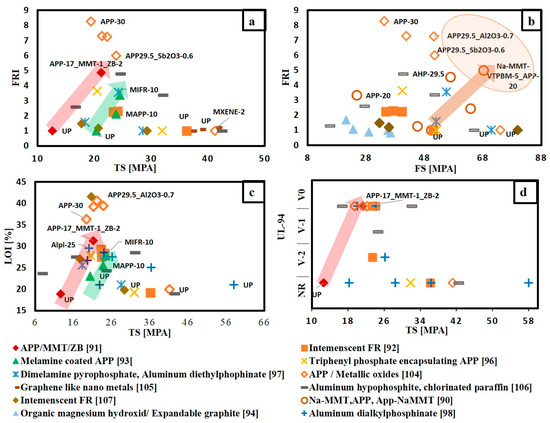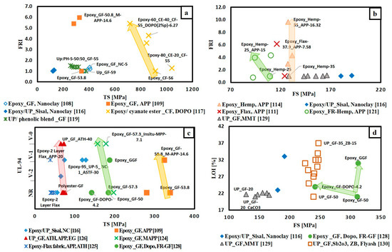 Based on the available data, different selection charts that relate flame retardancy performance with mechanical properties of FR/epoxy resin system are provided in Figure 4. Figure 4a,b relate UL-94 and LOI results with flexural strength, respectively, for different FR/epoxy resin systems. It can be noted that, although the addition of FRs of various FR/epoxy resin systems achieved V-0, the FS for these systems was reduced. However, the addition of biobased hyperbranched polymer containing DOPO (TA-HBP) [79] with different contents ranging from 3.8 to 13.7 wt.% shows enhancement in both flame retardancy performance and mechanical properties. This enhancement in both tensile and flexural strength was attributed to the partial engagement of the-NH-group (that is present in TA-HBP structure) with epoxy matrix during curing and that results in higher cross-linking density of epoxy resin. Thus, increasing crosslinks in epoxy matrix have enhanced the mechanical properties. Figure 4c shows that the addition of TA-HBP has increased FS, but FRI value is slightly above one. In addition, it can be noted that increasing wt.% content of nitrogen/sulphur-containing DOPO based oligomer (SFG) [84] from 2% to 8% has improved both flame retardancy performance and TS. The best condition was for SFG-8 that has reached V-0, FRI value of 2.55 and 13.7% increase in TS. Additionally, Figure 4a–c show that DPPEI-30 [64] which is a reactive curing agent has enhanced the flame retardancy performance in terms of LOI, UL-94 and FRI values without a significant change in both TS and FS. Moreover, Figure 4a–c show that DOPMA-13 [67] that has high FRI value around 11.76, LOI value of 34% and achieved V-0 in UL-94 test, has reduced both FS and TS by 29.4 and 25.6%, respectively.