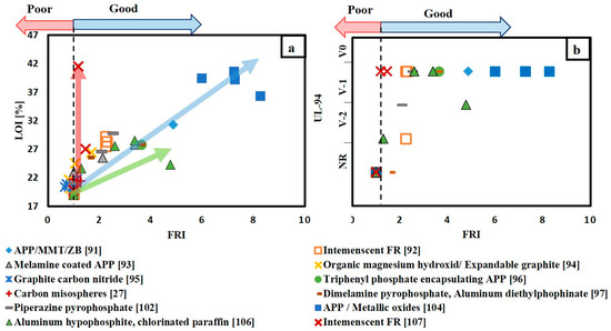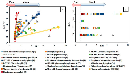 (a) FRI versus LOI for different FR/epoxy resin systems; (b) FRI versus UL-94 for different FR/epoxy resin systems.