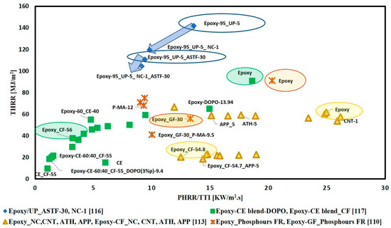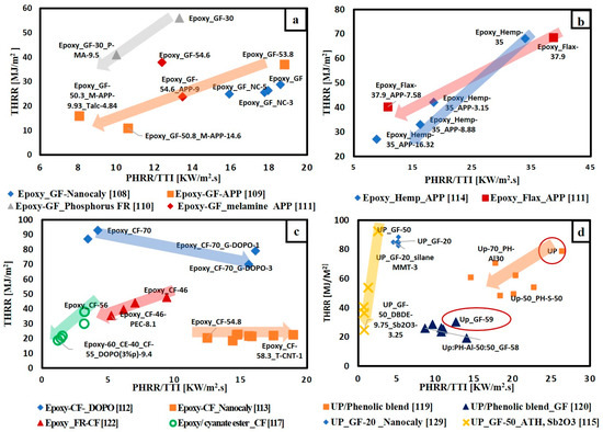To give a bright view of FR effect on flame retardancy performance of thermosetting polymer composites, the extracted data are classified according to the type of matrix, whether epoxy resin or unsaturated polyester resin and according to the type of fibre-fabric reinforcement whether glass fibre, carbon fibre or natural fibre. Figure 10 illustrates the variation of THRR with respect to PHRR/TTI for different FRs added to glass fibre-fabric epoxy composites (Figure 10a), carbon fibre-fabric epoxy composites (Figure 10c), natural fibre-fabric epoxy composites (Figure 10b) and glass fibre-fabric unsaturated polyester composites (Figure 10d). It is observed that ammonium polyphosphate (APP) is the most used FR in all types of composites. The direction of arrows in Figure 10a,b,d reveals that the addition of flame retardants enhanced the flame retardancy performance of glass and natural fibres reinforced epoxy composites as well as glass fibre reinforced unsaturated polyester composites. However, Figure 10c shows that the arrows for both Epoxy_ CF-DOPO [112] and Epoxy-CF_ Nano clay [113] systems go towards the right side (away from the origin), while the other two systems (Epoxy-FR-CF [122] and Epoxy/Cyanate ester-CF [117]) arrows’ go towards the origin. This can be attributed to the different techniques and types of FRs used in enhancing the flame retardancy. In the articles [112,113], the authors mixed the FRs with epoxy resin first, then the mixture was added to the carbon fibre. Carbon-based materials in the form of graphene grafted by DOPO(G-DOPO) [112] and carbon nanotubes [113] were used as FRs. These carbon materials the reduced time to ignition of composites. The ignition properties of polymers are affected by absorption coefficient and thermal inertia, which is the product of thermal conductivity, density and specific heat capacity [131]. It is to be noted that thermal inertia and the absorption coefficient have a contradictory effect on TTI. Time to ignition can be delayed by increasing thermal inertia and decreasing the absorption coefficient [132]. The addition of carbon materials is supposed to increase both the thermal conductivity and absorption coefficient of the composites. Regarding the ignition time, the increase in absorption coefficient induced by carbon fillers is more significant than the increase in thermal conductivity [131]. Furthermore, it can be noted that in case of adding G-DOPO to carbon/epoxy composites there is a reduction in THRR and this is due the sheet structure of G-DOPO that restrains the escape of volatile gas. Consequently, the transfer of heat to the internal matrix was hindered [112].