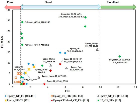 To compare the influence of adding FRs to fibre-fabric composites, regardless of the type of matrix resin or reinforcement, FRI versus FR wt.% was plotted for different FR/composite systems, as shown in Figure 12. It can be noted that almost all points are in the good zone, except that few points are located in the poor zone and one point is located in the excellent zone. The points that are located in the poor zone correspond to graphene grafted by DOPO(G-DOPO) [112] and carbon nanotubes [113] that are added to carbon fibre reinforced epoxy resin with a low loading content of below 5%. Alternatively, the point located in the excellent zone corresponds to bromine-based FR synergized with antimony trioxide that is added to glass fibre reinforced unsaturated polyester composite [115].