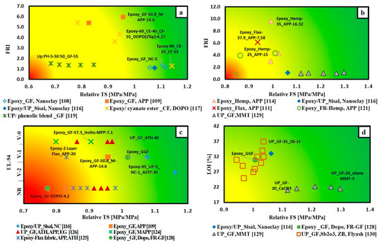 Selection chart of FR type regarding the desired flame retardance level and the relative mechanical property for unsaturated polyester resin (a) FRI versus relative TS; (b) FRI versus relative FS; (c) LOI% versus relative TS; (d) UL-94 versus relative TS.