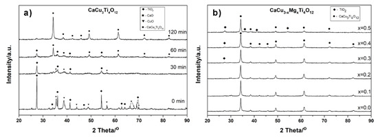 XRD diffraction patterns of: (a) substrate powders after different times of mechanochemical processing; (b) CaCu3−xMgxTi4O12 solid solutions with 0.1 ≤ x ≤ 0.5, prepared by the mechanochemical synthesis method.