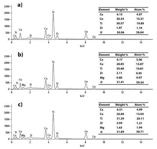 All of the EDS peaks from individual elements (Ca, Cu, Mg, Ti, O) and from the above-mentioned zirconia impurity were detected. The percentage of various elements in the tested samples was determined from the whole surface of the samples. The values of the individual elements for each sample, presented in the tables (Figure 2), are consistent with the expected stoichiometry of compounds.