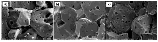 Scanning electron microscopy photographs of the surface of the CaCu3−xMgxTi4O12 samples sintered at 1075 °C for 2 h, where: (a) x = 0.0; (b) x = 0.2; (c) x = 0.4.