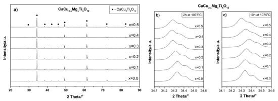 Figure 5a shows the XRD patterns of mechanochemically-prepared CaCu3−xMgxTi4O12 powders with different Mg2+ ions concentrations subjected to subsequent sintering at 1075 °C for 2h. The analogous samples, sintered at the same temperature for 10 h, are not shown in the paper due to their high similarity. In all of the diffraction patterns, regardless of the amount of modifier and sintering time, only one CaCu3Ti4O12 phase is visible (JCPDS 75-2188). Comparing these results to the diffraction patterns of the powders after mechanochemical treatment (Figure 1), the differences are clearly visible. The subsequent thermal treatment of the powders led to the reaction of the residual substrates; there are no visible diffraction reflections corresponding to the secondary phases (e.g., TiO2) or impurities from the grinding media (ZrO2). Additionally, the degree of the crystallinity of the ceramics has improved, as evidenced by the lower half-widths and higher intensities of the CCTO diffraction reflections.