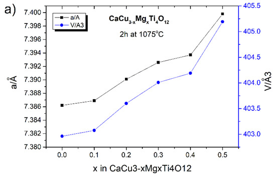In the case of the mechanochemically-produced solid solutions sintered for 2 h at 1075 °C, the value of the unit cell parameter (a) increases with the amount of modifier added. The calculated lattice parameters of these samples were 7.3862(4), 7.3869(5), 7.3901(3), 7.3926(1), 7.3937(2), and 7.3998(6) Å for the samples with x = 0.0, 0.1, 0.2, 0.3, 0.4, and 0.5, respectively. The unit cell volumes [Å3] for these samples are as follows: 402.9612; 403.0757; 403.5998; 404.0095; 404.1899; and 405.1911. This is also visible in a slight shift of the CCTO diffraction reflections towards lower values of two Theta angles (Figure 5b). Despite the similar ion radii in the same coordination, the partial substitution of magnesium ions (Mg2+ = 0.57 Å) for copper ions (Cu2+ = 0.57 Å) in the CCTO crystal lattice causes a slight change of unit cell parameter (a) because of the increase in the surface energy of the crystal. This is attributed to the chemical bond strength, defined as the ratio of the valence over the internuclear distance; the chemical bond of Mg–O (1.09) is larger than that of Cu–O (1.01). The obtained results are in accordance with the results reported by other authors [24]. Extending the time of the high-temperature treatment to 10 h also changes lattice parameter (a) of the CCTO unit cell. In this case, for smaller amounts of the modifier (x ≤ 0.3), this value decreases, while for larger amounts of Mg2+ (x ≥ 0.4) the (a) value increases (see Figure 5c and Figure 6. The sequence of lattice parameters of these samples was calculated: 7.3855(4), 7.3831(7), 7.3823(8), 7.3811(1), 7.3875(3), and 7.3898(7) Å. The unit cell volumes [Å3] for these samples are as follows: 402.8466, 402.4540, 402.3232, 402.1270, 403.1740, and 404.0570. The significant differences of the lattice parameters were observed. These results, in comparison with the previous ones, indicate that—in this case—other substitutional types of solid solutions may be formed. In addition, the long-term heat treatment of ceramics at a high temperature in an atmosphere containing oxygen (air) may also damage the crystal structure through the formation of various types of structural defects, including oxygen vacancies, etc. [27]. Moreover, the long-term high-temperature treatment of the ceramics could stimulate diffusion processes in the solid, and could thus lead to the substitution of larger zirconium ions (Zr4+ = 0.59 Å), from the grinding media, into the CCTO crystal lattice.