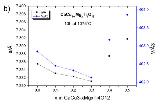 Lattice parameters of the mechanochemically-prepared CaCu3Ti4O12 and CaCu3−xMgxTi4O12 (0.1 ≤ x ≤ 0.5) samples, as determined from the XRD data, subjected to subsequent heat treatment for different times: (a) 2 h at 1075 °C; (b) 10 h at 1075 °C.