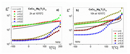 The temperature dependences of the real part of the dielectric permittivity (ε’) for the chosen frequency (1 kHz) are shown in Figure 7a,b for the solid solutions sintered at 1075 °C for 2 h and 10 h, respectively. The values of the function ε’(T) slightly increase below room temperature (RT) for all of the investigated samples. Below room temperature (RT), the values of the ε’(T) function do not change significantly for all of the investigated samples. The ε’ values at RT in Figure 7a for the CaCu3−xMgxTi4O12 ceramics with the lower Mg2+ ions content (x ≤ 0.2) are approximately 18,000 and 24,000 for x = 0 and x = 0.2, respectively. One can see that the ε’ for the samples with higher amounts of Mg2+ ions (x ≥ 0.3) shows ten-times lower values (~2000). In the temperature range above RT, the ε’ values for CaCu3−xMgxTi4O12 ceramics with x ≥ 0.3 increase rapidly. The high temperature treatment (10 h at 1075 °C) of the samples increases the values of the ε’ (Figure 7b). For the chosen ceramics at RT, the ε’ values are approximately 19,000, 34,000, 42,000 and 5600 for x = 0, 0.2, 0.3 and 0.5, respectively. These results are usually observed in the literature [8,9,26,30]. The high ε’ values may be interpreted as an internal barrier layer capacitor (IBLC) effect [31]. According to this model, CaCu3−xMgxTi4O12 ceramics are constituted of semiconducting grains and insulating grain boundary layers. The studies of the ceramics using impedance spectroscopy allowed us to separate the grain and the grain boundary contributions [26]. All of the parameters of the equivalent circuit model show a variation in the resistance of the grain and the grain boundary with the amount of MgO used during the ceramic synthesis. According to the literature [32] data, it can be concluded that the grain boundary resistance of the investigated ceramics is closely related to the concentration of oxygen vacancies at the grain boundaries, the charge of which contributes to the polarization mechanism. The value of this resistance depends on the thermal treatment (the sintering time and sintering temperature) of the CaCu3−xMgxTi4O12 ceramics. As the content of Mg2+ ions in the samples increases, the grain boundary resistance increases. This is due to the ability of the Mg2+ doping ions to inhibit oxygen loss in the samples. Therefore, the increase of ε’ with Mg2+ ion substitution may be attributed to the formation of the insulating grain boundary layers with an Mg-rich phase. The results reported in the literature [8,15,26,27,30] show that the high ε’ values of CCTO ceramics are caused by the electrical response of the grain boundaries. In all probability, higher amounts of Mg2+ ions in CaCu3−xMgxTi4O12 ceramics cause an increase in the grain boundary capacitance, which leads to an increase in the values of ε’. On the other hand, according to the results of the microstructure analysis (Section 3.1), it was found that the ε’ values depend on the grain size, their shape, and their number of pores. Thus, the properties of the microstructure (e.g., the number of pores) may result in decreased ε’ values. The highest values of ε’ in the whole temperature range were observed for CaCu3−xMgxTi4O12 ceramics with an Mg2+ ion content of x = 0.3, sintered at 1075 °C for 10 h (Figure 7b).