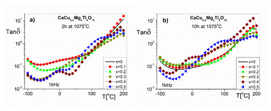 The temperature dependence of the loss angle tangent for CaCu3−xMgxTi4O12 sintered at 1075 °C for (a) 2 h and (b) for 10 h.