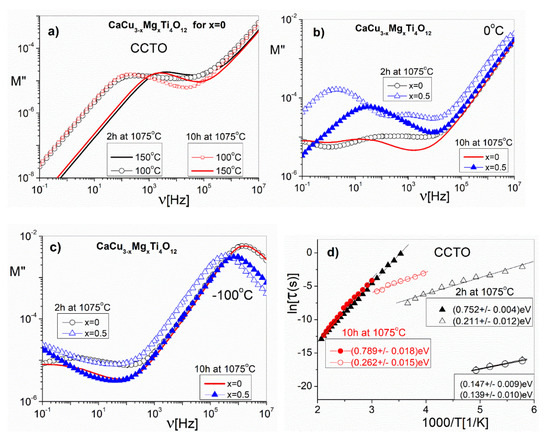 Frequency dependence of the imaginary part of the electric modulus (M’) of the CCTO (sintered at 1075 °C for 2 h and 10 h) samples at two chosen temperatures (a); CaCu3−xMgxTi4O12 (for x = 0 and x = 0.5) at a 0 °C temperature (b); CaCu3−xMgxTi4O12 (for x = 0 and x = 0.5) at a −100 °C temperature (c); and the temperature dependence of the relaxation times obtained from the frequency-dependent plots of M” (d).