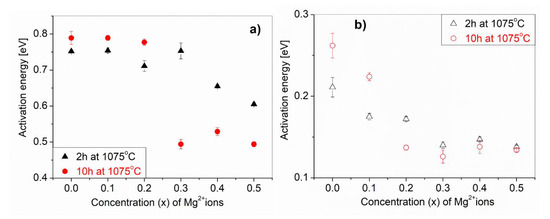 Figure 10 shows the dependence of the activation energy of the conduction process (a) and dielectric relaxation (b) from the amounts of Mg2+ ions (x) for CaCu3−xMgxTi4O12 solid solutions. We can clearly see that Mg2+ ion doping decreases the activation energy of both processes. The activation energy of the conductivity relaxation process corresponding to the grain boundaries for the CCTO sample was found to be approximately 0.8eV. Sinclair et al. [31] determined an activation energy of the CCTO grain boundaries equal to 0.60 eV. For the CaCu3−xMgxTi4O12 solid solutions with higher amounts of Mg2+ ions (x ≥ 0.3) and a high temperature treatment (10 h at 1075 °C), this activation energy decreased to about 0.5eV (Figure 10a). The grain activation energy 0.140eV of our CCTO sample is different from the 0.08eV of the CCTO grains [32]. From the slopes of the fitted straight lines, we obtain the activation energies (Figure 10b) for the Maxwell–Wagner relaxation, which generally refers to interfacial polarization occurring in electrically-inhomogeneous systems.