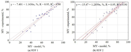 The correlation between the experiment results and the model data for MY is shown in Figure 1. The confidence interval for correlation was 95% (dotted lines). The results showed that the proposed general model had correlations of 95% with the experimental data for RDF 1 and RDF 2, respectively. Obtained results indicate that the proposed model concerning pyrolysis’ T, t, and knowledge of RDF composition could be useful to predict the MY produced from pyrolyzed RDF.