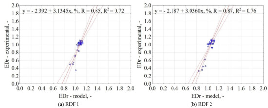 The correlation between the experiment and the model data for EDr is shown in Figure 2. The correlation between the proposed general model and experimental data was 85% for RDF blend 1 and 87% for RDF blend 2, respectively. It means that based on pyrolysis’ T, t, and knowledge of RDF composition share, it is possible to predict the energy densification ratio of RDF after its carbonization.