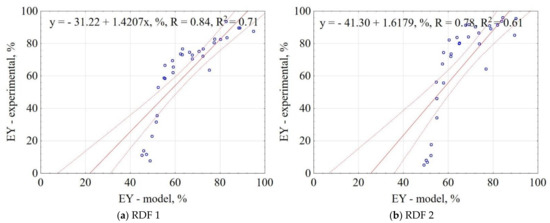 The correlation between the experiment and the model for EY is shown in Figure 3. The confidence interval was 95%. The results showed that the proposed model explains 74% and 61% of data variability for RDF blend 1 and RDF blend 2, respectively. The obtained results indicate that it is possible to predict EY with accuracy over >60% based on pyrolysis T, t, and RDF composition share.