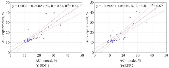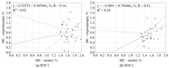 The correlation between the experiment and the model data for MC is shown in Figure 4. The results showed that the proposed model could not predict the MC of CSF, and it explains only 2% and 10% of data variability for RDF blend 1 and RDF blend 2, respectively. The MC of CSF was characterized by high scatter. Caution should be exercised with the proposed model for MC.
