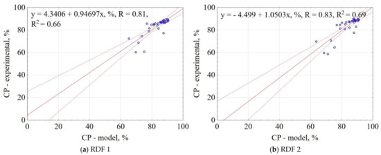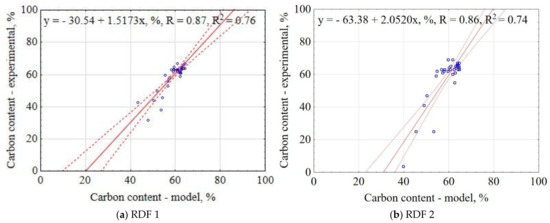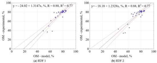 The correlation between the experiment and the model data for OM is shown in Figure 5. The results showed that the proposed model explains 77% of the data variability for RDF 1 and RDF 2, respectively. The confidence interval was 95%. The largest concentration of results is in the range 80–85% for experimental data and 75–85% for models, which means the model lowers the value slightly. The results indicate that based on the assumptions of pyrolysis T, t, RDF components share, it is possible to predict the OM in carbonized RDF.