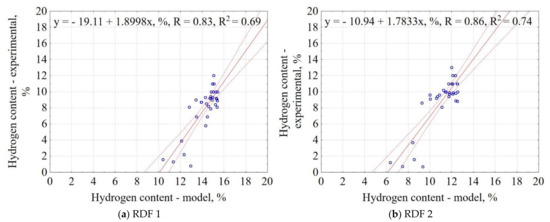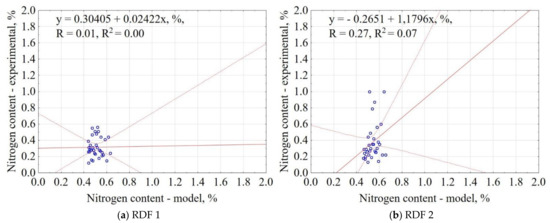 The RDF mixtures were used for validation of the general models. The mixture consisted of the following fractions: RDF—carton, 9.64%; fabric, 6.20%; kitchen waste, 4.02%; paper, 9.64%; plastic, 34.23%; rubber, 9.6%; PAP/AL/PE composite packaging pack, 12.22%; wood, 14.45%; RDF 2—carton, 8.57%; fabric, 9.54%; kitchen waste, 7.10%; paper, 8.57%; plastic, 45.24%; rubber, 7.71%; PAP/AL/PE composite packaging pack, 5.81%; wood, 7.46%. More detailed information is presented elsewhere [14].