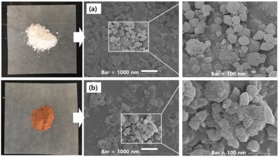 Figure 2 shows the morphological properties and particle size of empty (Figure 2a) and propolis-embedded zeolite nanocomposites (Figure 2b). As shown in Figure 2, propolis-embedded zeolite nanocomposites were had a brown color (Figure 2b), while empty zeolite nanocomposites revealed a white color (Figure 2a), as shown in Figure 2a. The microscopic morphology of propolis-embedded zeolite nanocomposites was not significantly changed compared to empty zeolite nanocomposites, even though they slightly aggregated each other.