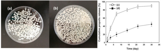 PLA/PCL pellets complexed with propolis-embedded zeolite nanocomposites: (a) PLA/PCL pellets; (b) PLA/PCL pellets complexed with propolis-embedded zeolite nanocomposites. Drug release from propolis-embedded zeolite nanocomposites (c) and PLA/PCL pellets complexed with propolis-embedded zeolite nanocomposites (d).