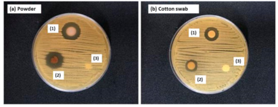 To evaluate the antibacterial activity of propolis-embedded nanocomposites and PLA/PCL pellets, the power of the drug and nanocomposites was used as shown in Figure 4a (Powder). Chlorohexidine (CHX) powder was used for comparison. As shown in Figure 4(a1), CHX powder clearly built an inhibition zone. Propolis-embedded zeolite nanocomposites also formed a similar inhibition zone compared to CHX powder, while empty zeolite power did not form an inhibition zone, indicating that zeolite itself has weak or no antibacterial activity (Figure 4(a2,a3)). To evaluate the changes in antibacterial activity during the pellet fabrication process, liberated propolis aqueous solution from PLA/PCL pellets was also tested using C. albicans as shown in Figure 4b (cotton swab). As shown in Figure 4(b1), the CHX solution in the cotton swab clearly built an inhibition zone. Liberated propolis aqueous solution from PLA/PCL pellets also formed an inhibition zone, even though its inhibition zone was smaller than that of CHX solution (Figure 4(b2)). Eluted solution from empty zeolite nanocomposites did not form an inhibition zone as expected (Figure 4(b3)). Table 1 summarizes the comparison of the inhibition zones estimated from Figure 4.