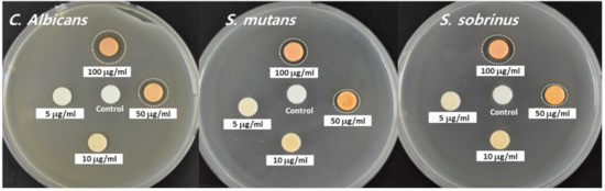 The antibacterial activity of propolis embedded in zeolite nanocomposites and PLA/PCL pellets was evaluated with various oral bacteria, such as C. albicans, S. mutans and S. sobrinus, as shown in Figure 5 and Table 2. Propolis was eluted from PLA/PCL pellets using EtOH and diluted 1000 times with aqueous solution. As shown in Figure 5, less than 10 μg/mL of eluted propolis did not clearly form an inhibition zone. An inhibition zone was formed at higher than 50 μg/mL propolis, and its area was dose-dependently increased in all bacterial strains, as summarized in Table 1. These results indicated that the fabrication process of propolis-embedded zeolite nanocomposites and PLA/PCL pellets did not significantly affect the intrinsic property of propolis and maintained antibacterial activity.