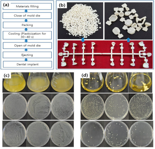 (a) Typical processing of implant fabrication. (b) Dental implant fabricated from propolis-embedded zeolite and PLA/PCL polymer. Antibacterial activity against E. coli: (c) PLA-PCL composite pellets; (d) propolis-embedded zeolite/PLA-PCL nanocomposite pellets.