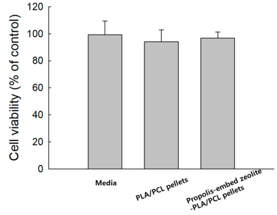 To study intrinsic cytotoxicity of the dental implant against normal cells, HaKaT cells (1 × 104 cell/well) in a 96-well plate were exposed to various compounds (100 μg/mL), such as media only, empty PLA/PCL pellets and PLA/PCL pellets containing propolis-embedded zeolite nanocomposites. Viability of cells was evaluated with MTT cell cytotoxicity assay. Cells were incubated with various compounds for 1 day. Following this, MTT (30 μL, 5 mg/mL in PBS) was added to the 96-well plates and then further incubated for 3 h to form formazan crystals. Then, cells were solubilized with DMSO, and the absorbance (560 nm test/630 nm reference) was determined with an Infinite M200 Pro microplate reader (Molecular Device Co., Sunnyvale, CA, USA). Results were calculated from eight wells and expressed as mean ± standard deviation (S.D.).