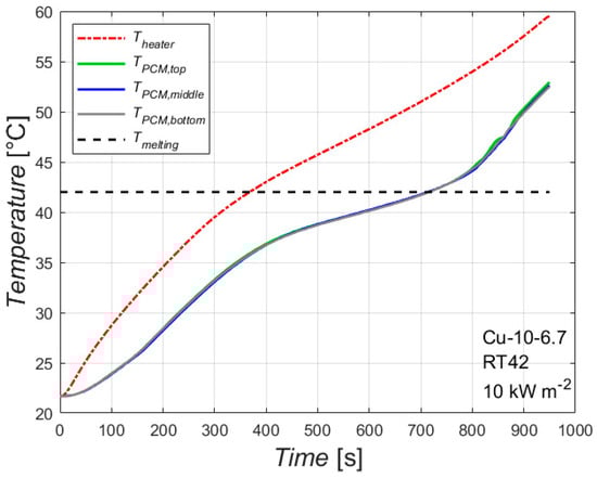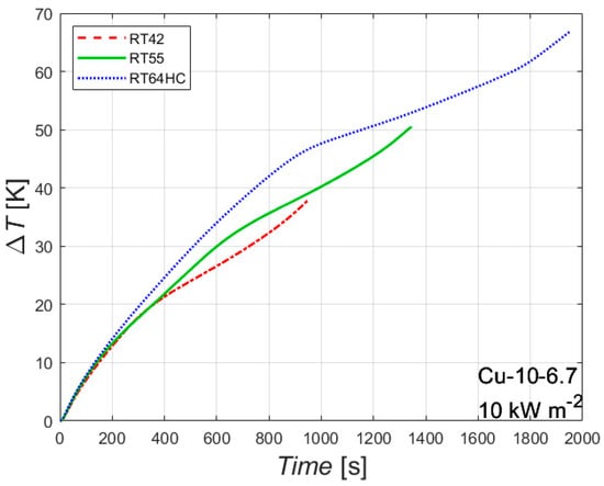 The effect of the melting temperature is shown in Figure 6. The figure reports the difference between the wall temperature of the heated side and the initial temperature plotted against the time, for the foam Cu-10-6.7 with an imposed heat flux of 10 kW m−2 for three different PCMs having different melting temperatures. The melting temperature has almost no effect on the first part of the experimental test, where only sensible heat is involved, since all the three tested paraffins have similar thermophysical properties for the solid state. As soon as the melting temperature is reached, the slope of the curve changes, and, as a result, the curve related to the paraffin RT42 is the first one that changes its slope, followed by RT55 and RT64HC.