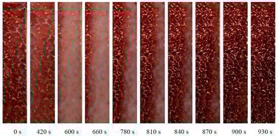 Figure 3 can be coupled with Figure 4, which shows some pictures taken from the glass window of the module at different moments. When the melting of the PCM starts, there is a change of the transparency of the paraffin: at 420 s for instance, the temperature of the heated side is higher than the melting temperature, and therefore the paraffin on the left side has a different transparency compared to the paraffin on the right side. The sequence of these pictures demonstrates that, for the considered physical sizes of the foam block, the melting front is quite parallel to the heated side, meaning that the 20 mm thick foam structure tends to inhibit the natural convection of the PCM. As time goes by, the melted liquid paraffin tends to overcome the solid paraffin due to volume variation from solid to liquid conditions, and this may explain the reason why the last part of PCM to melt is on the bottom right corner of the foam.
