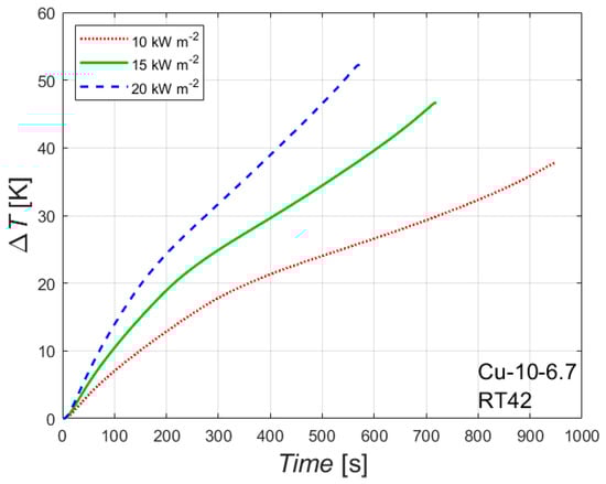 The effect of the heat flux on the melting process is reported in Figure 5, which reports ΔT versus time for the foam Cu-10-6.7 embedded with the paraffin RT42. ΔT represents the difference between the temperature of the wall in contact with the heater and the initial temperature. Considering ΔT instead of the temperature itself allows us to compare data with different initial temperatures. However, the three experimental conditions considered in Figure 5 have initial temperatures within ± 2.1 K.