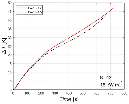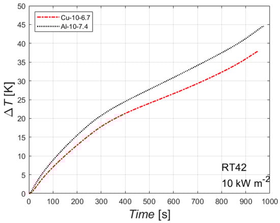 The effect of the foam parent material is shown in Figure 8. The figure reports the difference between the heated wall temperature and the initial temperature, plotted against the time, for the paraffin with a melting temperature of 42 °C with an imposed heat flux of 10 kW m−2, for two foams with different parent material but with the same number of PPI and about the same relative density (6.7% for the copper foam and 7.4% for the aluminum foam). The data for the aluminum foam are borrowed from Diani and Campanale []. The parent material has no effect on the time needed to completely melt the PCM inside the foam block, but it affects the temperature difference: the copper foam shows a lower temperature difference, i.e., a lower temperature on the heated side, which is more favorable for a real application. This can be attributed to the higher thermal conductivity of the parent material, which enhances the thermal performance at constant heat flux and melting temperature. Similar conclusions can be drawn for the other combinations of heat flux and melting temperature.