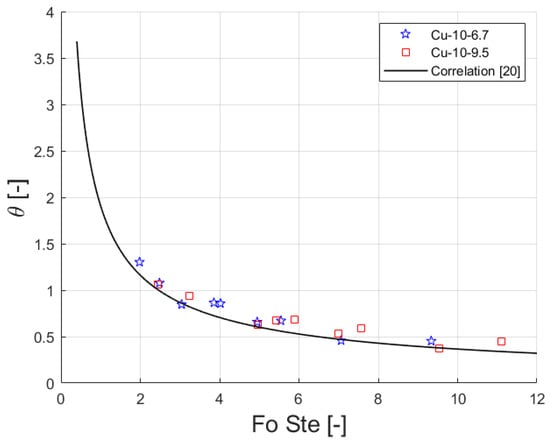 In this section, the experimental results of time needed for a complete melting of the PCM and the temperature reached by the heated side at the end of the heating process are compared against the values predicted by the correlation proposed by Diani and Campanale []. The model correlates a dimensionless temperature, θ, to the product between Fourier number, Fo, and Stefan number, Ste, as, Equation (1):