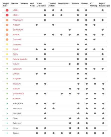 With the continuous advancement of technology and the need more than ever for alternative energy sources for a sustainable economy, the world has promoted a great interest in the development of more and efficient electrical vehicles (Li-ion batteries), more renewable energy supply (eolian, photovoltaic, fuel cells) or advanced industrial technologies (robotics, drones, 3D printing). Each of these industrial fields is based on an important supply of raw materials, which needs to be addressed before it becomes a critical shortage. A selection of critical and non-critical raw materials used in these technologies are shown in Figure 1. The analysis bottlenecks for each technology can result in a very low supply risk and very high supply risk, based on market research reports and publicly available information (Figure 2) [9].