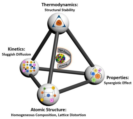 To design suitable alloys that are able to reduce the amount of CRMs, it is important to have in view the four core effects of CCAs because of the diversity of the multiple elements that are alloyed to obtain specific properties (Figure 3) [17].
