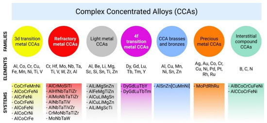 In Figure 4, the used elements for each CCA family are presented. Moreover, we illustrated some examples of the most investigated CCA chemical compositions concerning each family.