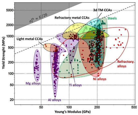 The diagram presented in Figure 5 shows a comparison between the family of CCAs and conventional alloys (Mg-, Al-, Ti-, Fe- and Ni-based alloys and refractory alloys). Each family of alloys occupies a particular area of property space, represented by large and colored bubbles. The upper left gray corner shows the theoretical strength (σy = E/20) delimiting the boundary of the inaccessible region of the plot. CCA classes are among the wide range of conventional alloys considered. It can be seen that light metal CCAs are found in the space between the Mg alloys class and Al alloys class, which offers new design options for this new class of materials. In contrast, refractory metal CCAs are located at the top, closer to the theoretical tight yield limit than other alloy families [5].