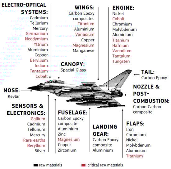 Many engineering applications require materials that have as their main condition the ability to be used in extreme conditions of temperature, pressure, or corrosion. Materials that work in these harsh environments must maintain their performance at high levels. For example, turbine blades in jet engines operate very close to their melting temperature in an oxidizing environment [40]. The materials used in different parts of the fighter aircraft are presented in Figure 6 [9]. The elements from the CRM group are written in red.