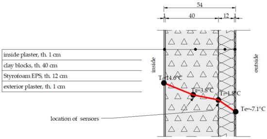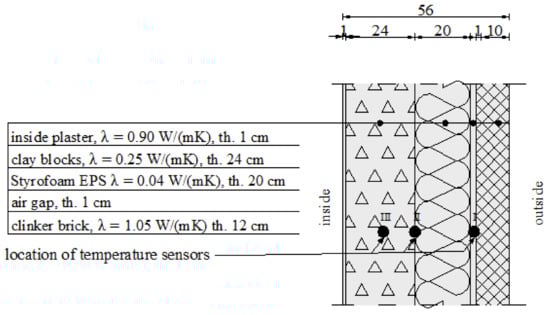 The classical method of analysing the temperature distribution in the building envelope consists of embedding temperature sensors (typically electrical resistance sensors) in it during the building construction or renovation. This solution was applied during the renovation of a three-layer building envelope by placing sensors in four layers [] The testing focused on the temperature distribution and the possibility of the occurrence of water vapour condensation. The applied three-layer system was composed of a brickwork wall, polyurethane insulation with an aluminium foil layer, an air gap, and a brickwork wall, which worked well. Another way is to scan the building envelope surface using a thermographic camera. The methodology of the testing is discussed in detail in []. The study also presents the method of a theoretical calculation of temperature on the outer surface of a multilayer building envelope exposed to 24-h changes in ambient temperature caused by solar radiation and measured using a thermographic camera.