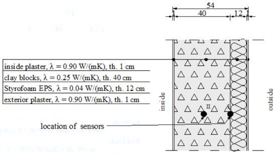 The first wall consists of hollow clay blocks, a thermal insulation layer, and clinker bricks. The second—of hollow clay blocks and thermal insulation finished with plaster. These wall types are the most common solutions for the two- and three-layer systems. The first wall was analysed using classical temperature sensors, whereas the second was tested with FBG sensors. The environmental conditions in the terms of air temperature, wind speed, and air humidity were monitored by a classical meteorological station located on the university campus. A temperature monitoring system was constructed inside the building envelope walls. The system is based on fibre Bragg grating (FBG) temperature sensors. The essence of the solution is to introduce FBG sensors at the appropriate points of the cross section of the wall of the structure. In the case of the building envelope in the form of a wall, the appropriate places are the borders of individual layers and points in the middle of a given layer. The places were pre-determined using numerical simulations.