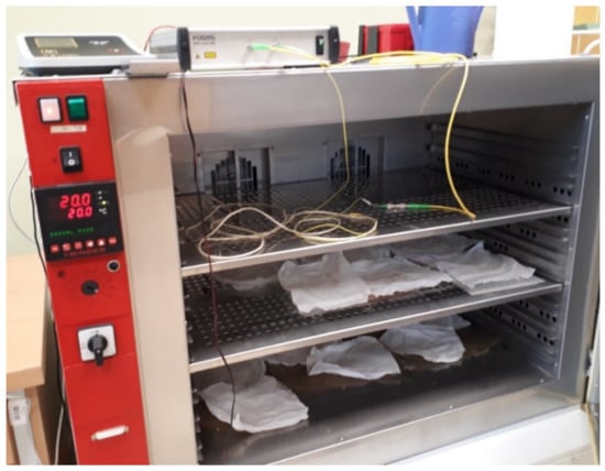 The constructed fibre optic system intended for the measurement of temperature inside the external wall was first tested in laboratory conditions. The tests consisted of setting known values of temperature in the climatic chamber containing the set of sensors and presented in Figure 4. The tests were carried out in the Laboratory of Geosynthetics of the University of Bielsko-Biala, Poland. The laboratory is equipped with a climatic chamber with a certified temperature measurement system.