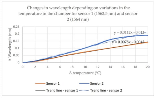 Changes in wavelength depending on temperature changes—sensor 1 and sensor 2.