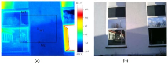 Temperature measurement of the wall from the outside using a thermographic camera (a) and the outside view of the wall (b).