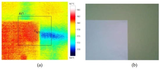 Temperature measurement of the wall from the inside using a thermographic camera (a) and the view of the wall and the white sheet of paper (b).