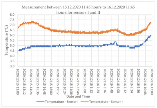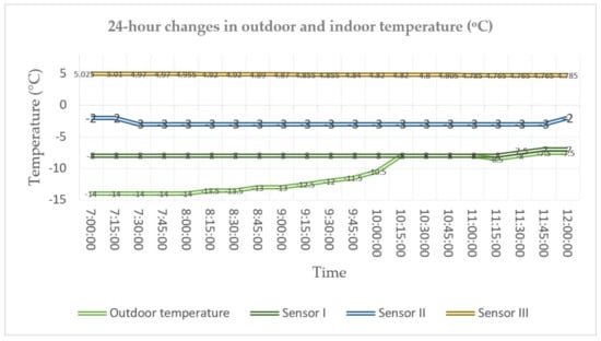 Considering the large number of data obtained for the two-layer wall, a 24-h measurement was performed. The outdoor temperature in the analysed periods varied in the range from −1 °C to 4 °C. Figure 8 illustrates the temperature distribution determined based on previously performed calibration tests in the calibration chamber.