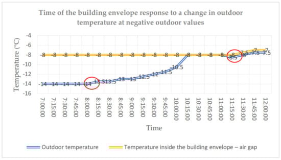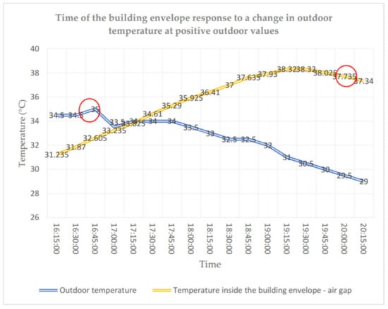 In the case of positive values of the outdoor air temperature, the temperature in the building envelope is less stable and rises due to heat accumulation to levels higher than the outdoor temperature (cf. Figure 12). At the maximum outdoor temperature of 35 °C, the temperature in the air gap reaches over 38 °C. The delay in the temperature change in layer 2 due to the temperature drop from 16:45 h onwards totals 3 h. The delay totals about 3 h both for negative and positive values of outdoor temperatures.