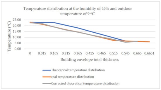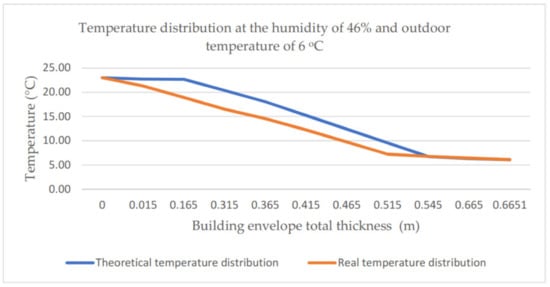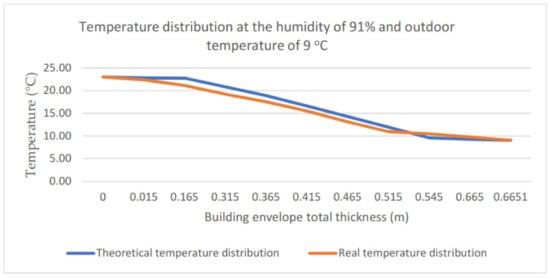 The performed analyses also drew attention to differences between the theoretical and the real temperature distribution. They become visible especially if the air relative humidity is included in the range of 40–50% (cf. Figure 13). The theoretical and real temperature distributions in the building envelope obtained for the ambient air relative humidity of 46% and outdoor temperature of 6 °C are presented in Figure 13. Figure 14 presents the distributions for a relative humidity of 91% and outdoor temperature of 9 °C. For high values of relative humidity (90–100%), a good agreement can be observed between the theoretical and experimental temperature distribution (agreement up to 1 °C). The difference between the values determined experimentally (14.57 °C) and theoretically (18.06 °C) for the case with relative humidity at the level of 46% and the air outdoor temperature of 6 °C totals 3.49 °C. It is an essential difference, which reappeared in subsequent measurements.